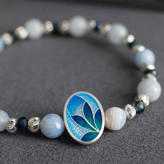 Enamel Beaded Bracelet, Agate And Kyanite Elastic Bracelet With Cloisonne Enamel Detail