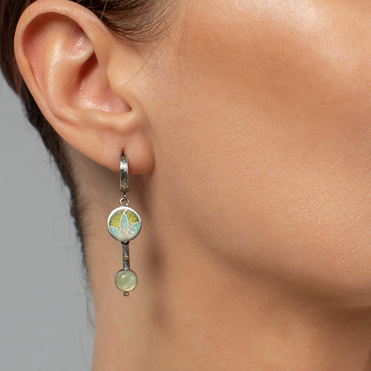 Prehnite Drop Earrings With Gold Beads And Cloisonne Enamel