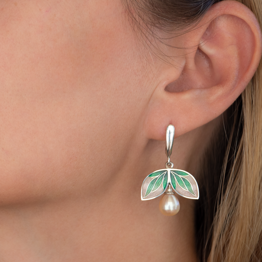 Hortensia Two Leaves Cloisonné Enamel Earrings With Rose Freshwater Pearls