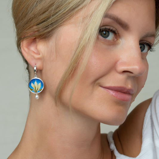Pale Yellow Floral Earrings With White Pearls. Cloisonné Enamel Technique