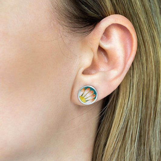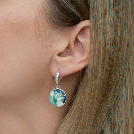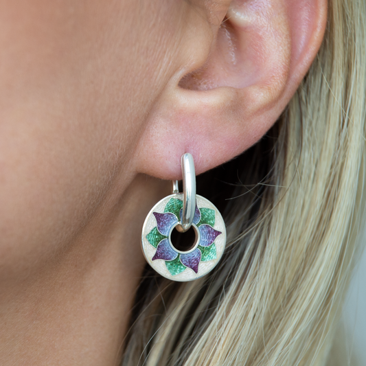 Cloisonné Enamel, Sterling Silver, Round Earrings Snowdrops