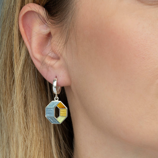 Grey Yellow Octagon Earrings, Cloisonne Enamel And Sterling Silver Earrings