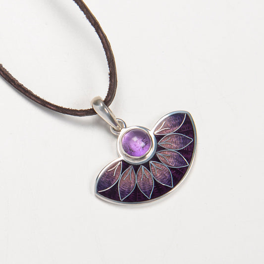 Purple Leaves Semicircle Cloisonné Enamel and Amethyst Pendant