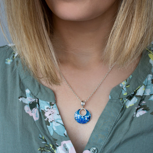 Cloisonné Enamel Pendant Blue Lotus, Sterling Silver Necklace