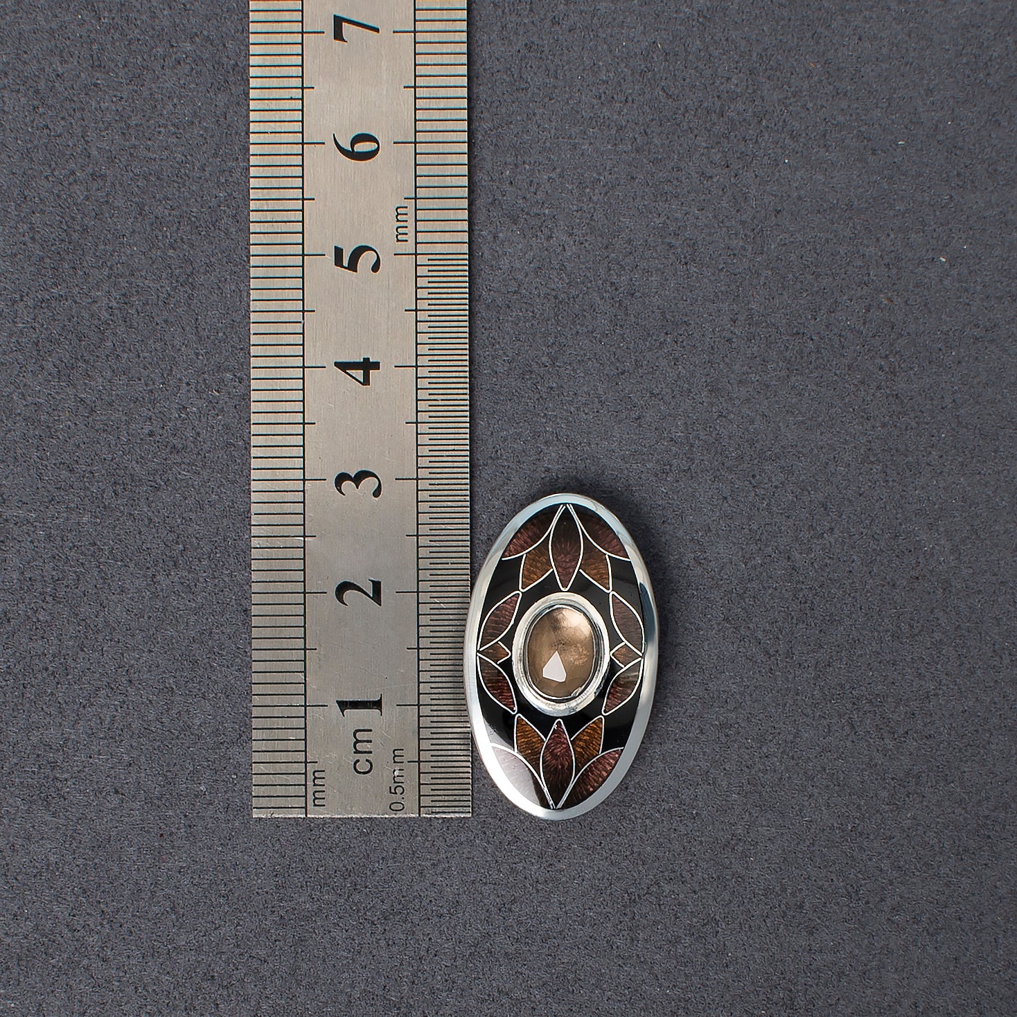 Sterling silver base 925, fine silver wire, hot cloisonne enamel, adjustable leather strap, 9x7 mm faceted Smoky Quartz stone