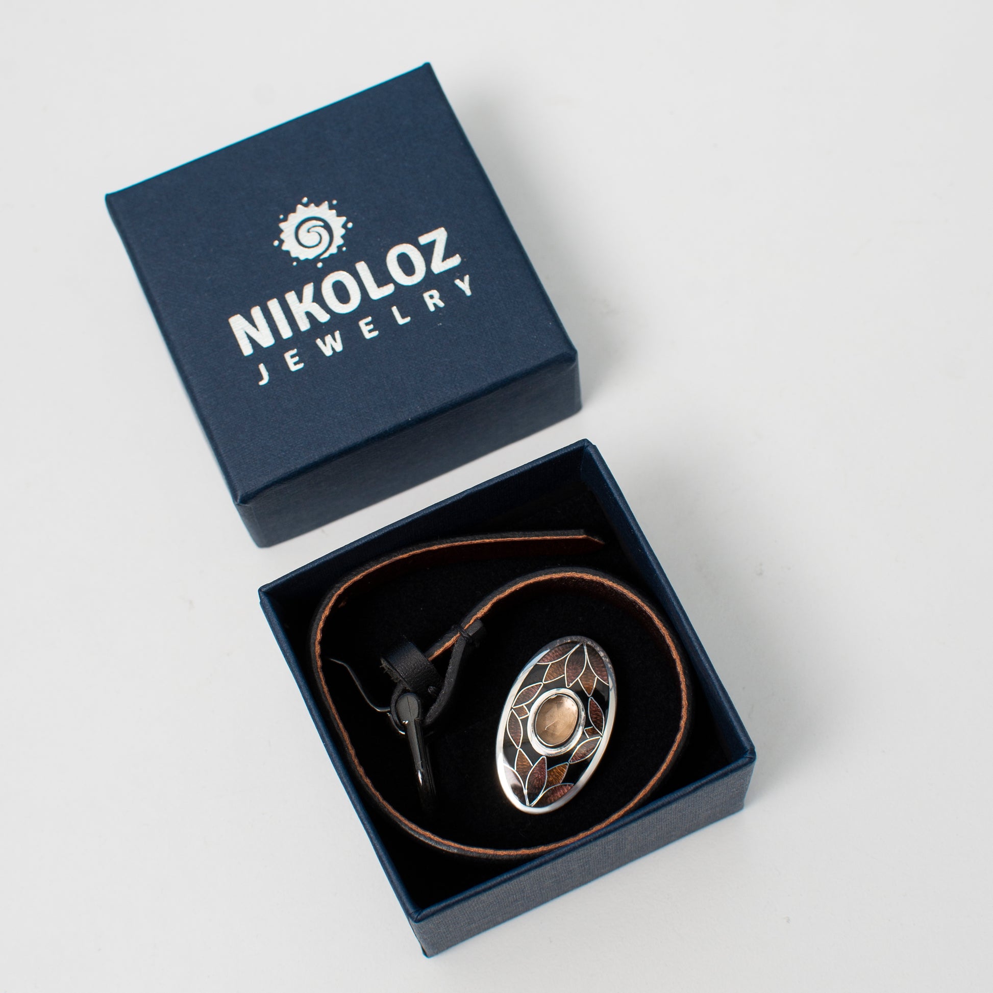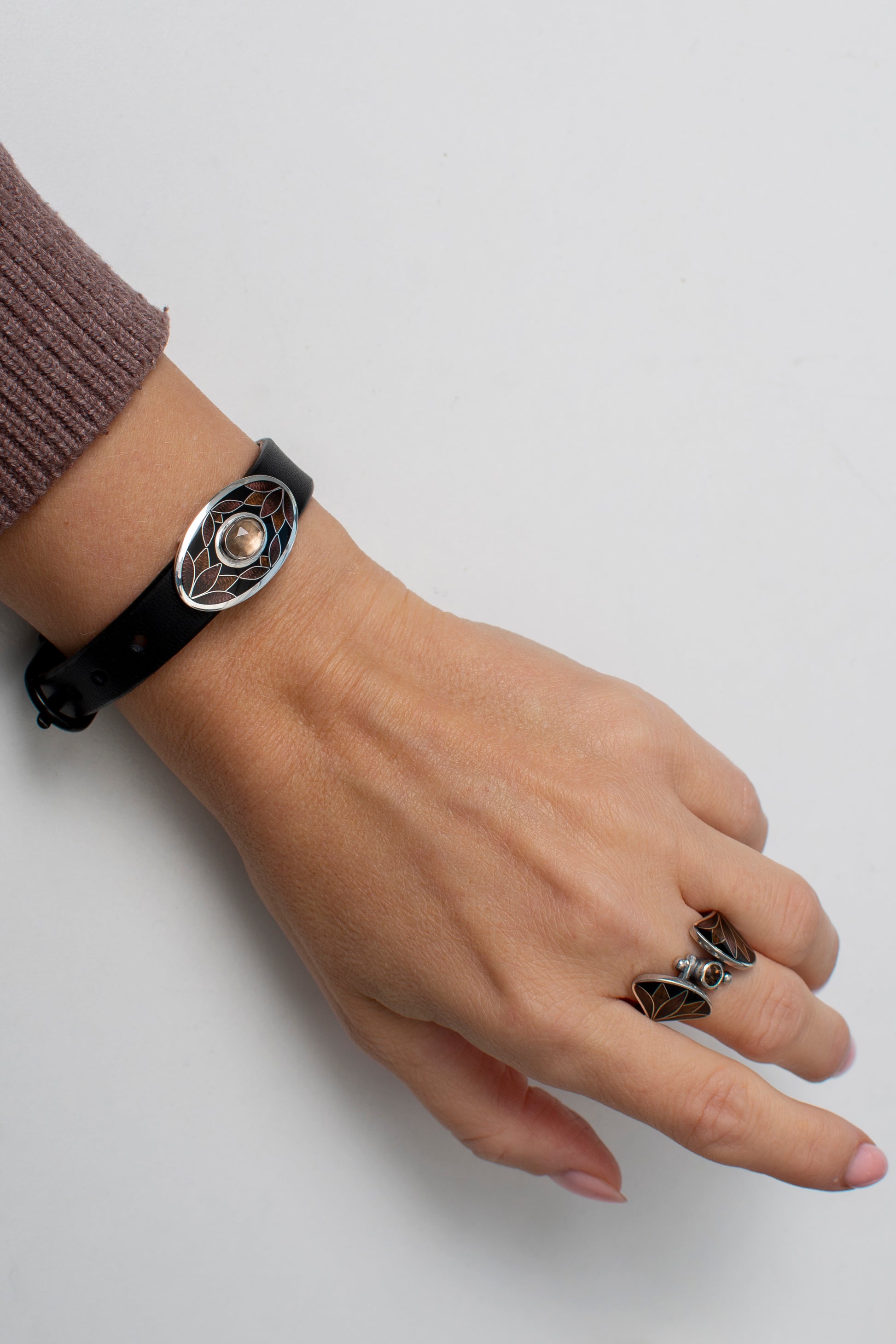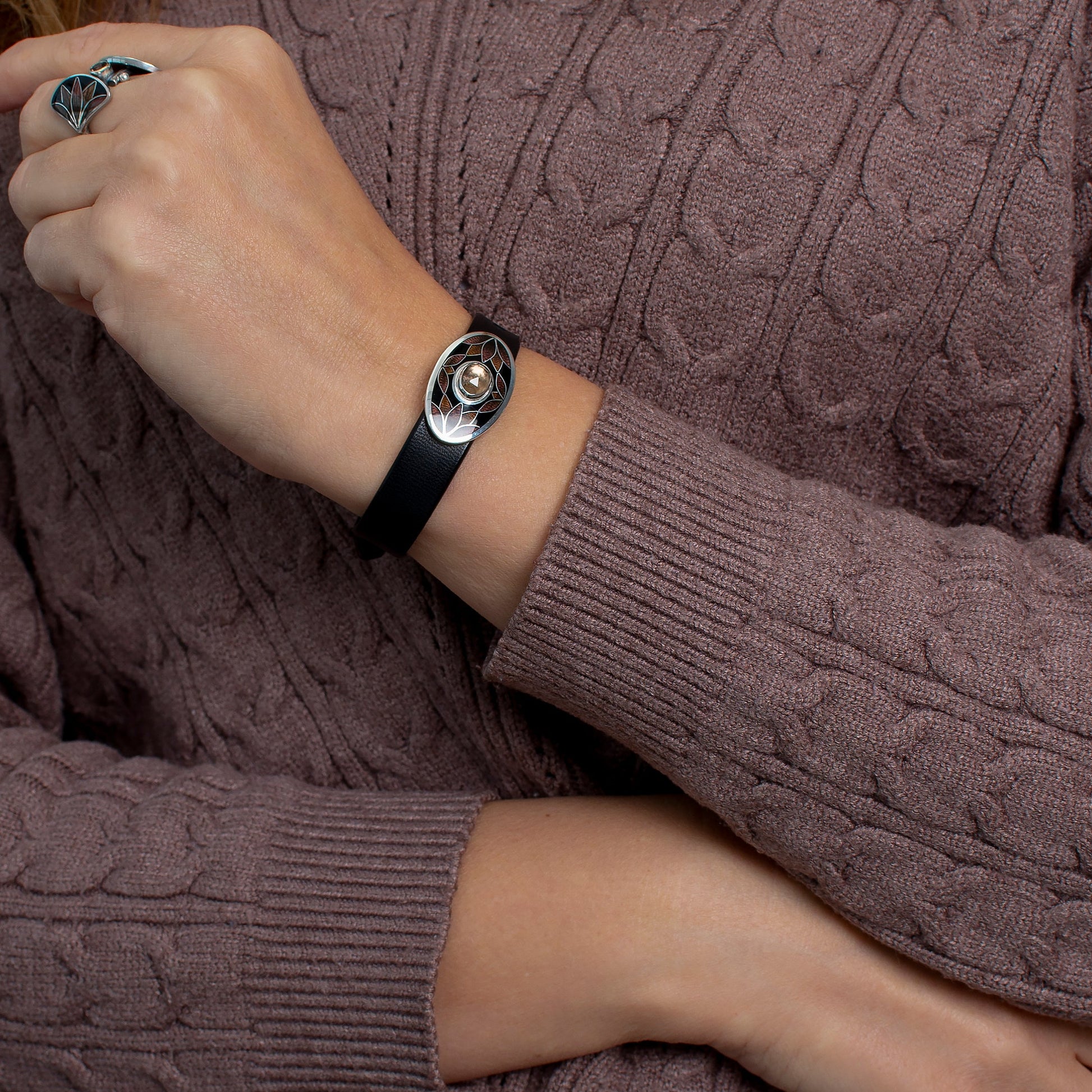 This stunning leather strap bracelet features an oval centerpiece meticulously decorated using the ancient Cloisonné Enamel technique. Rich, earthy tones and deep brown enamel are bordered by fine silver wires, creating an intricate pattern reminiscent of autumn leaves.