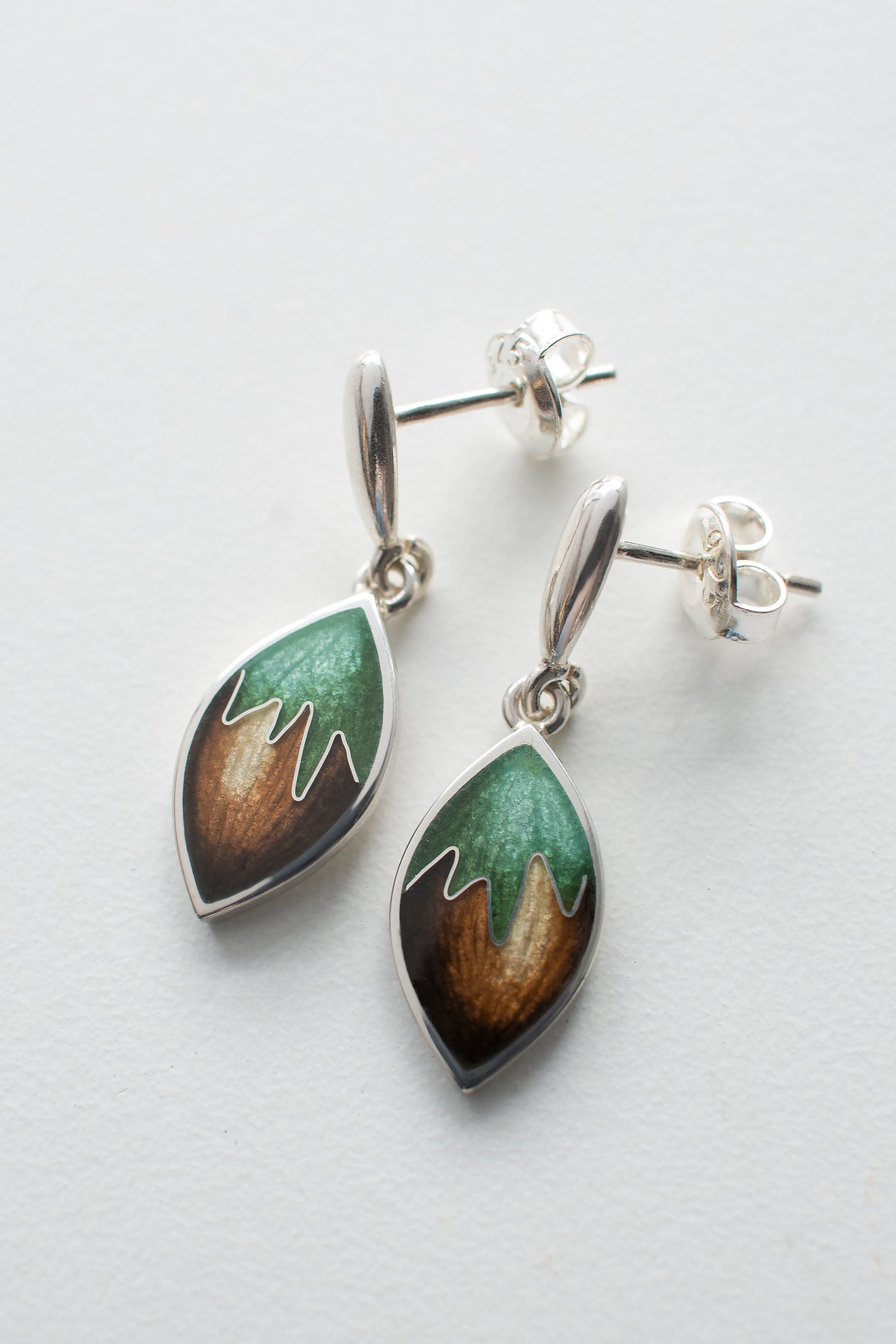 Cloisonne Enamel Hazelnut Earrings: Sterling Silver Dangle Studs
