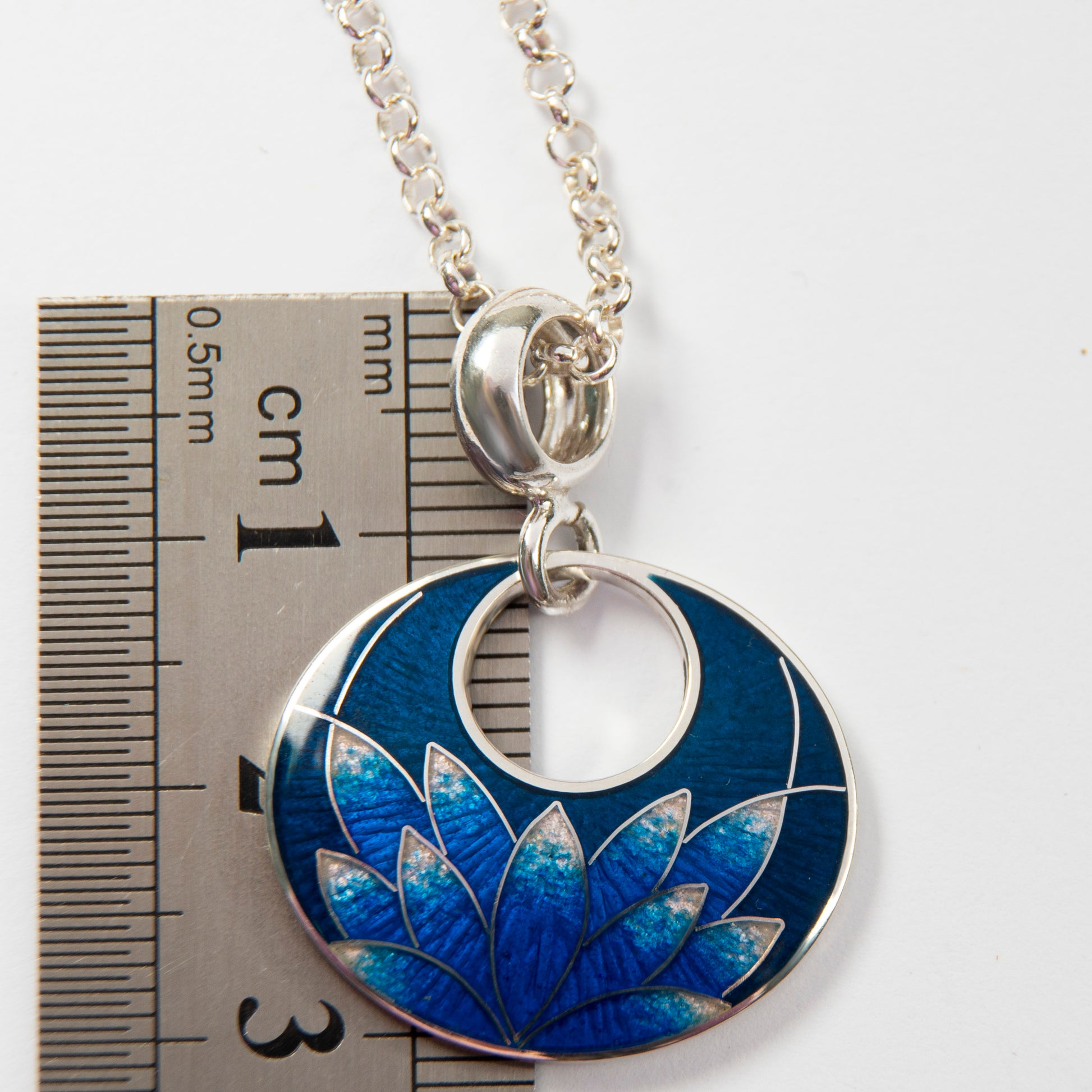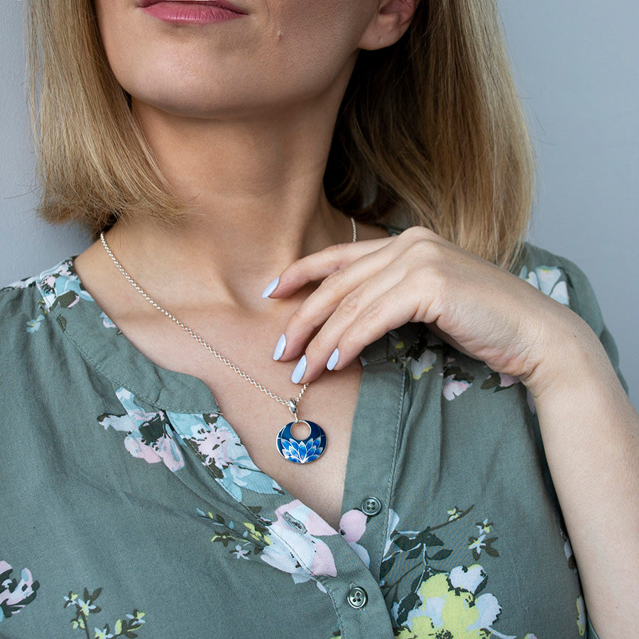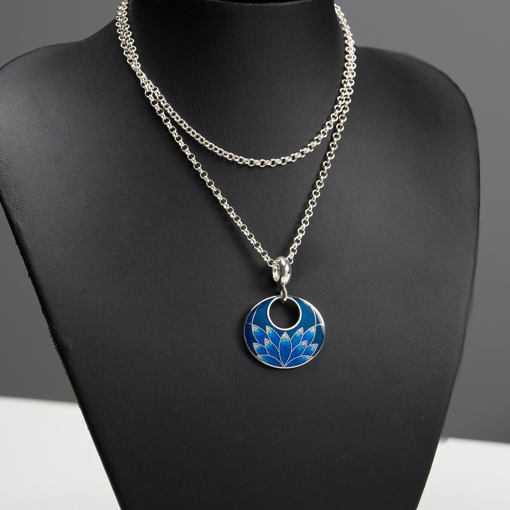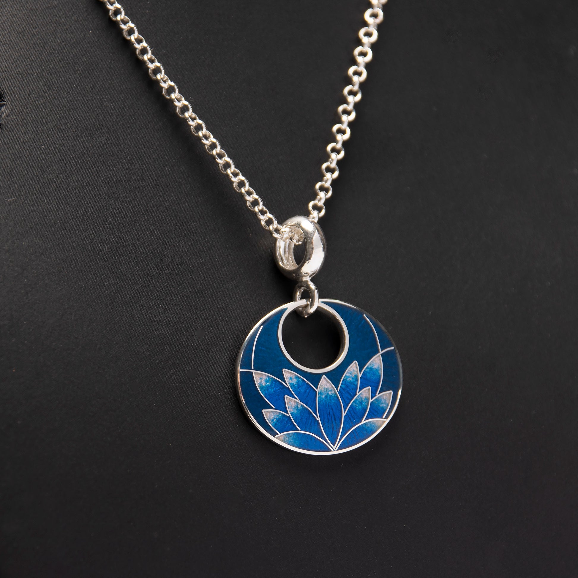 Cloisonné Enamel Pendant Blue Lotus, Sterling Silver Necklace