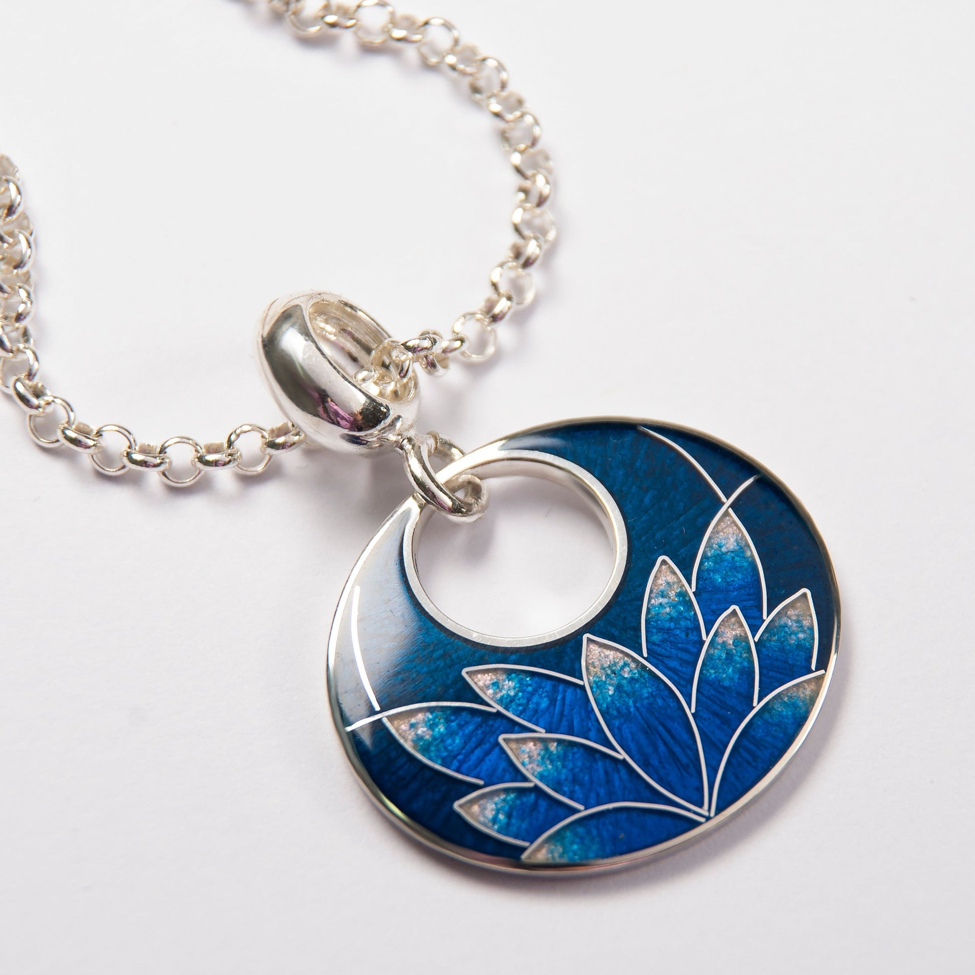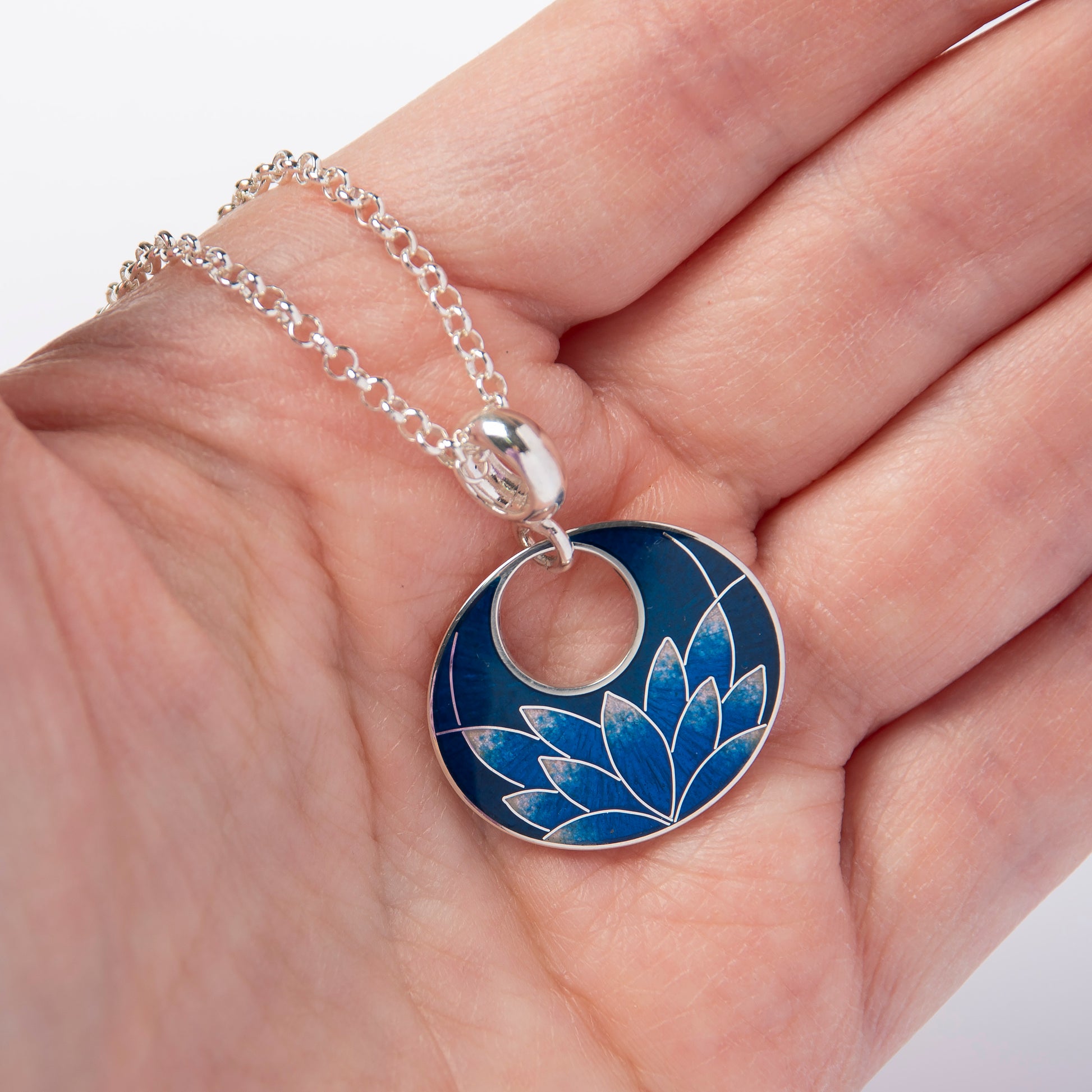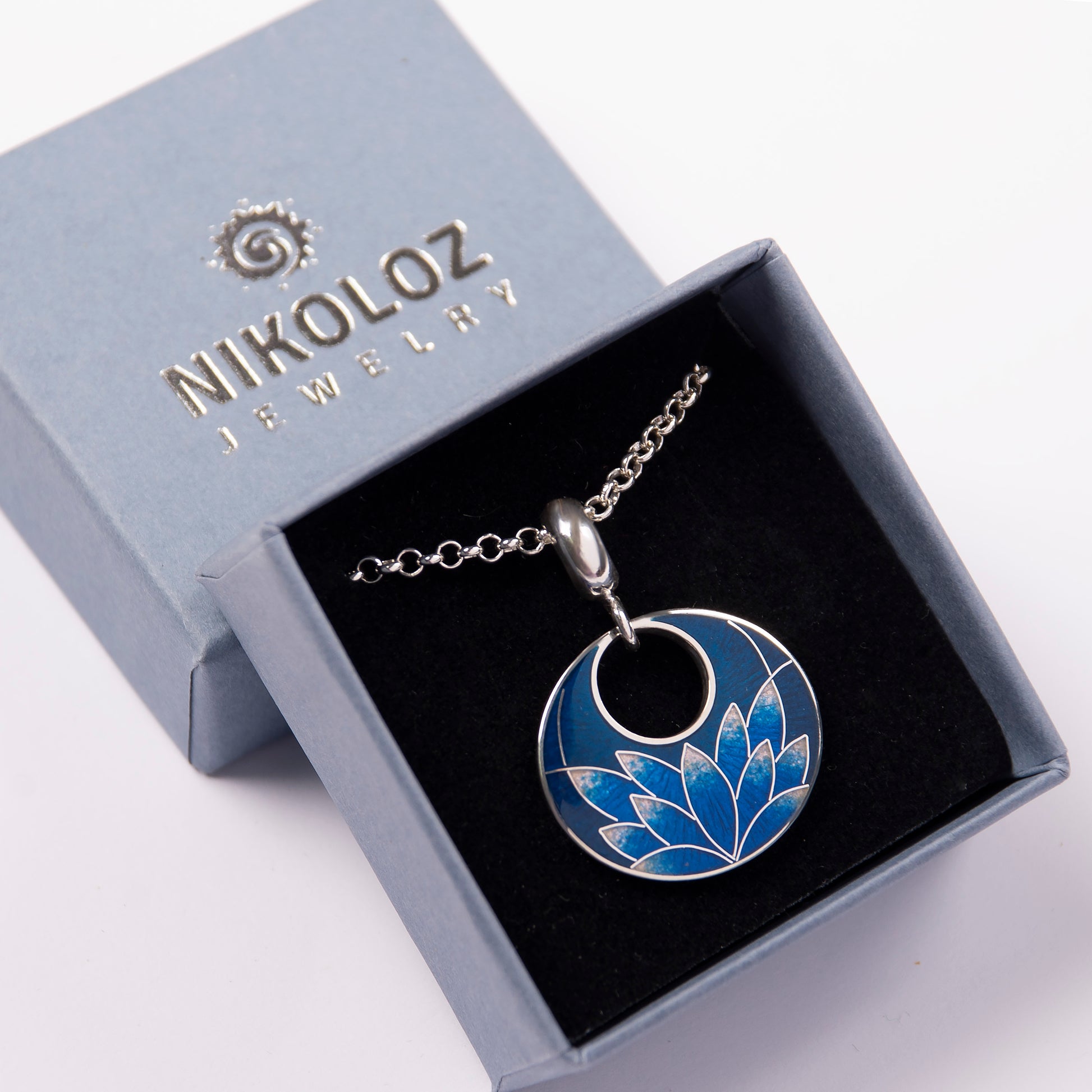 Cloisonné Enamel Pendant Blue Lotus, Sterling Silver Necklace