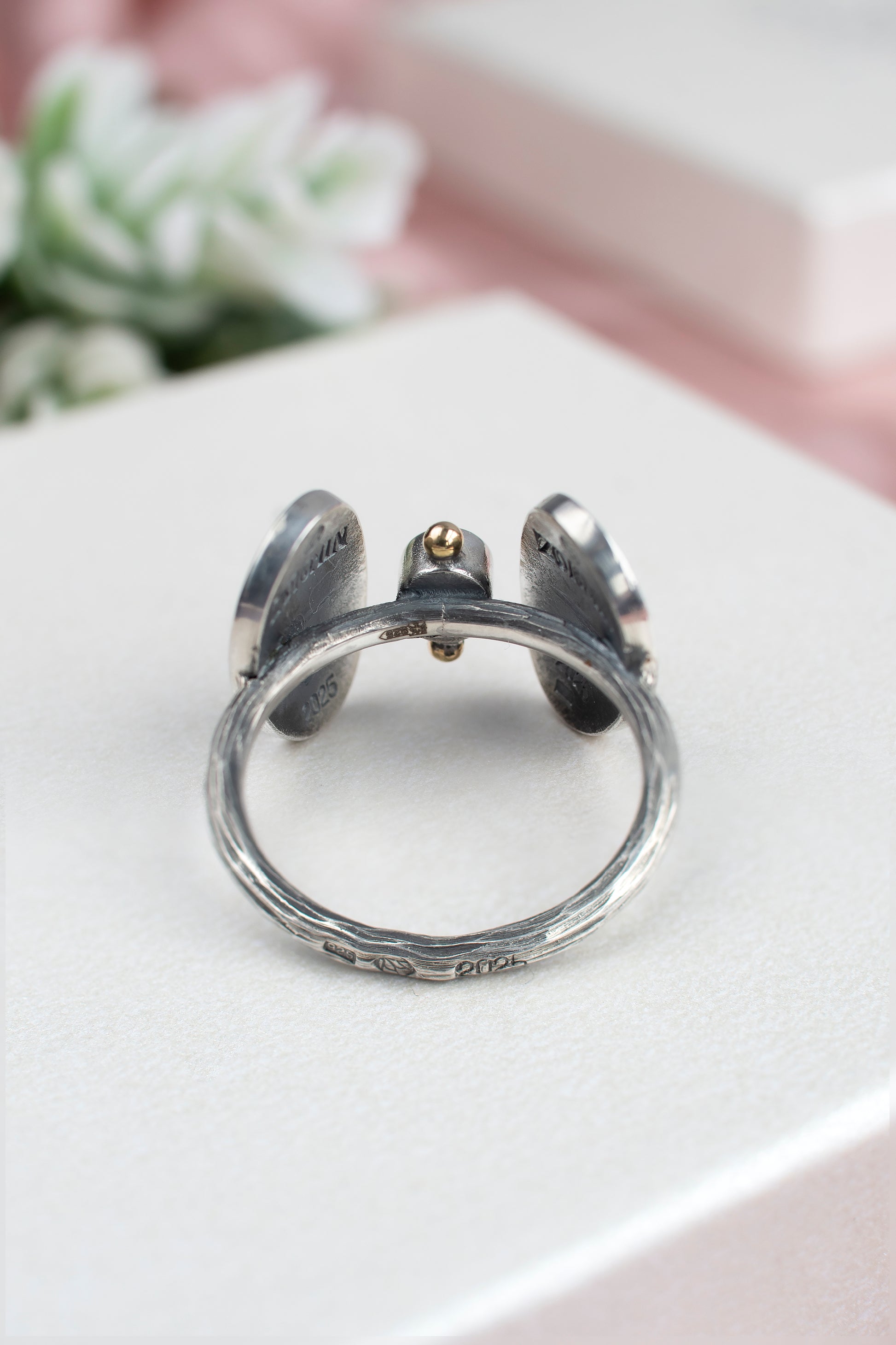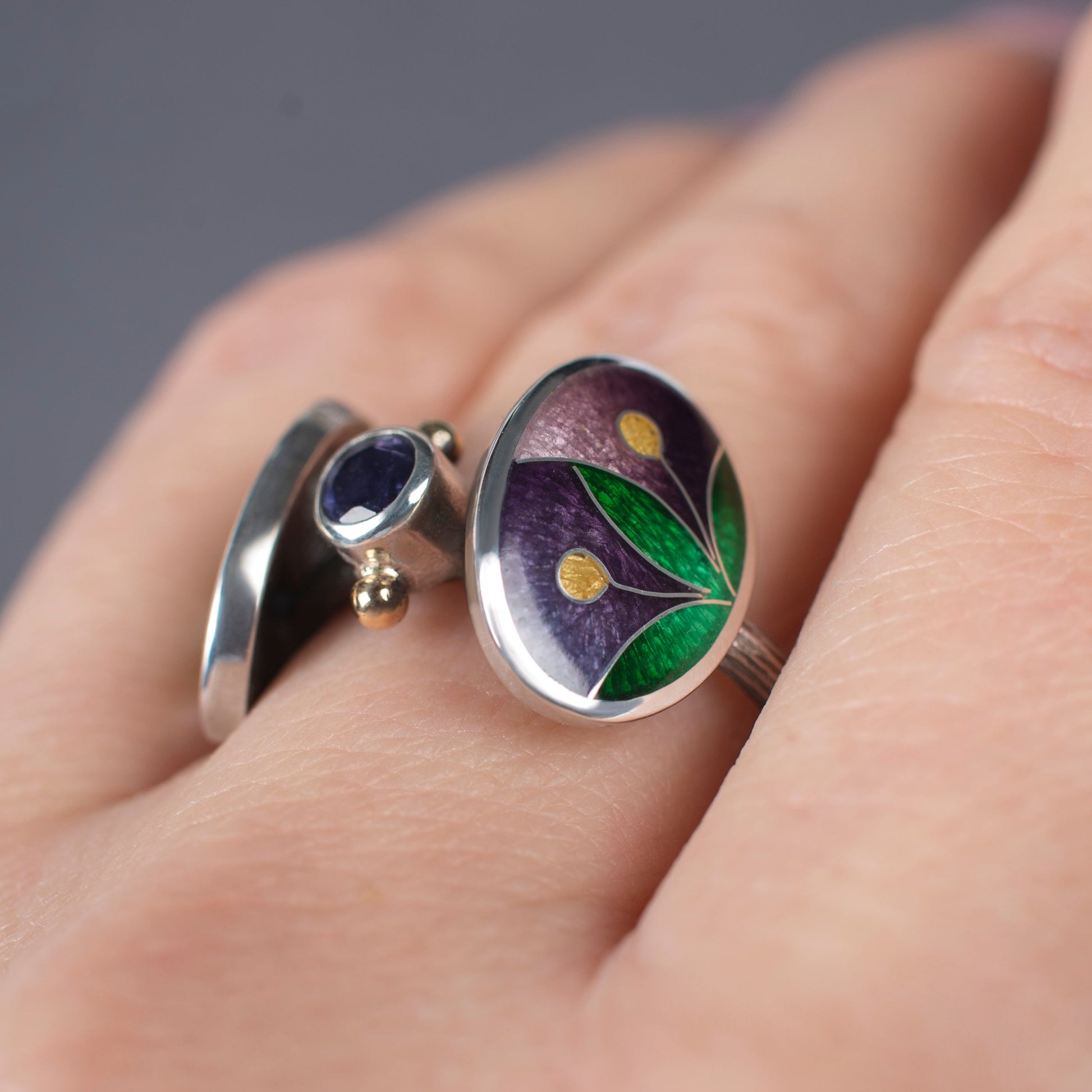 This exquisite Cloisonné Enamel and Iolite stone is a statement piece that blends ancient technique with a modern, floral silhouette. This ring features two oval enamelled panels that frame a central gemstone.