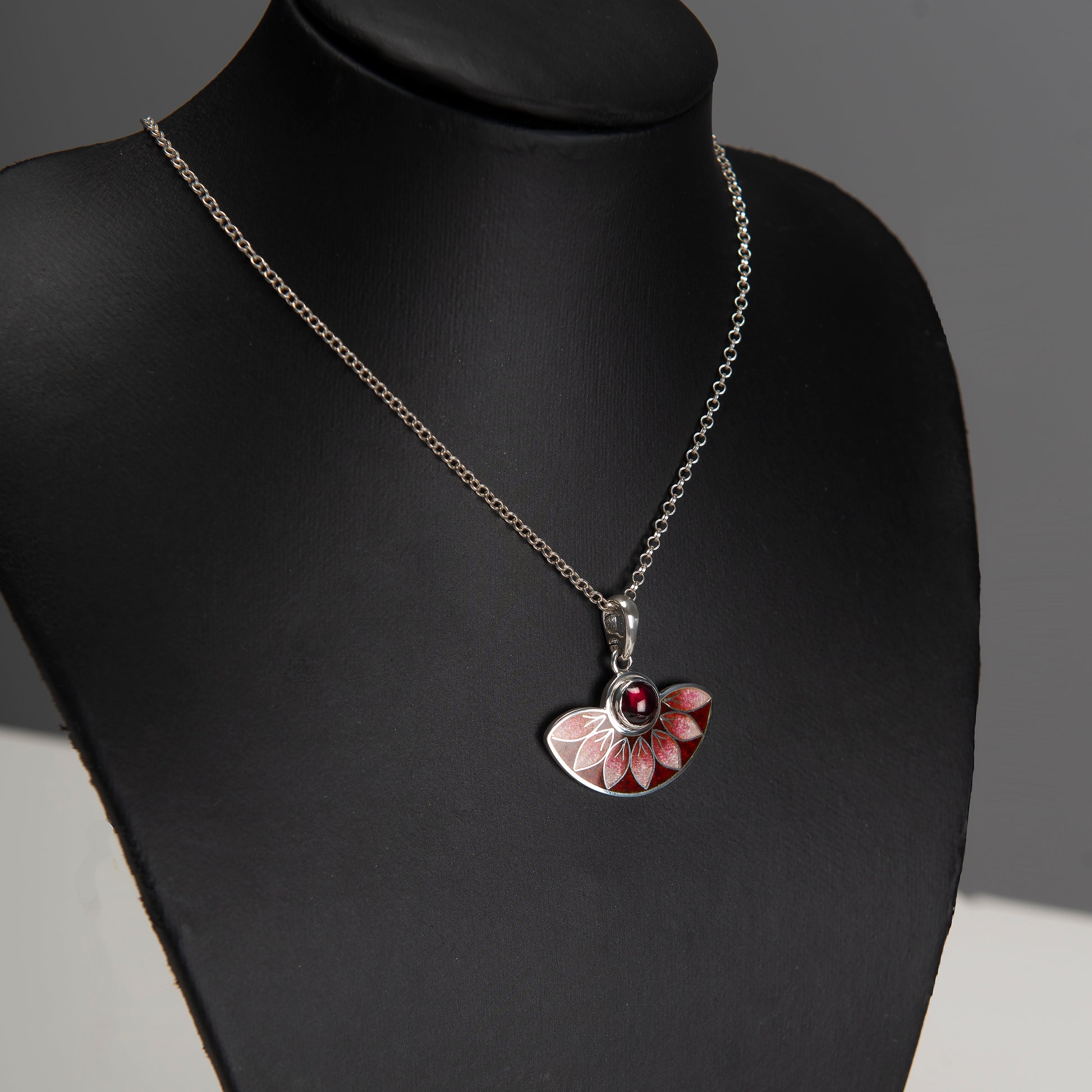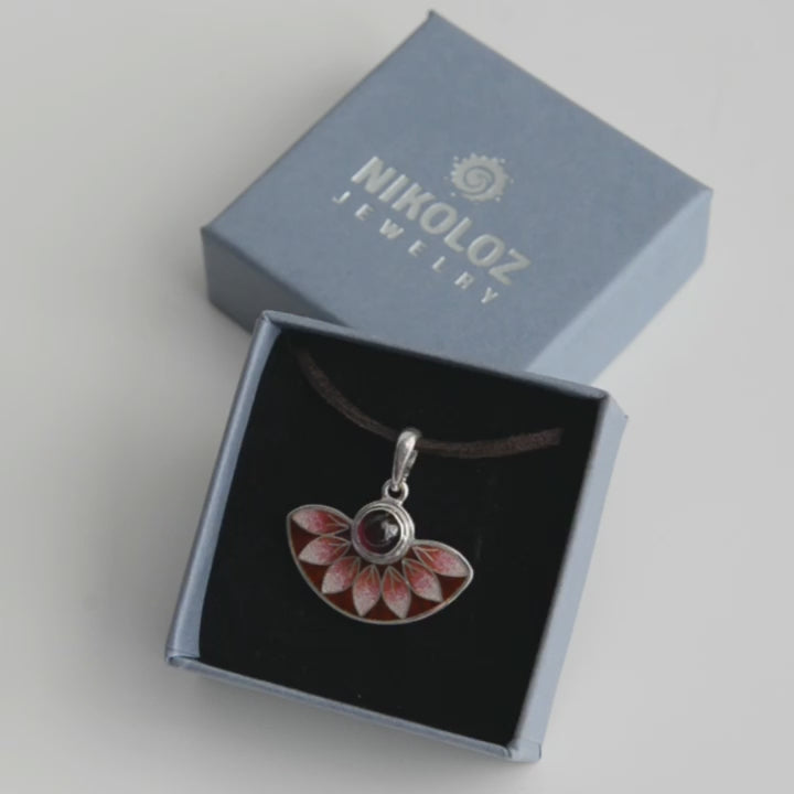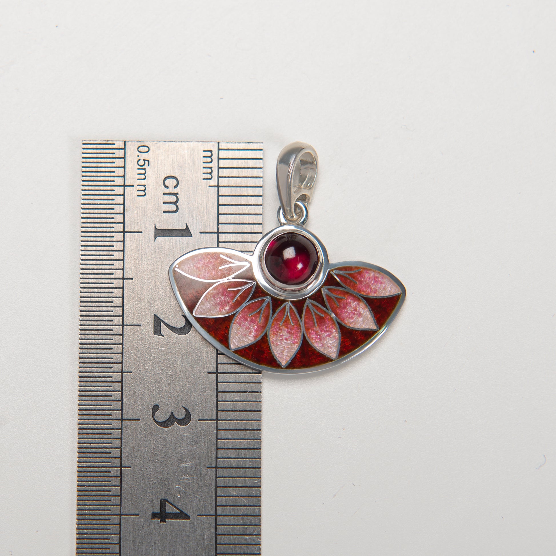 Sterling silver base 925, fine silver wire, cloisonne enamel, 5 mm Garnet stone, 45 cm or 50 cm silver neck chain (additionally)