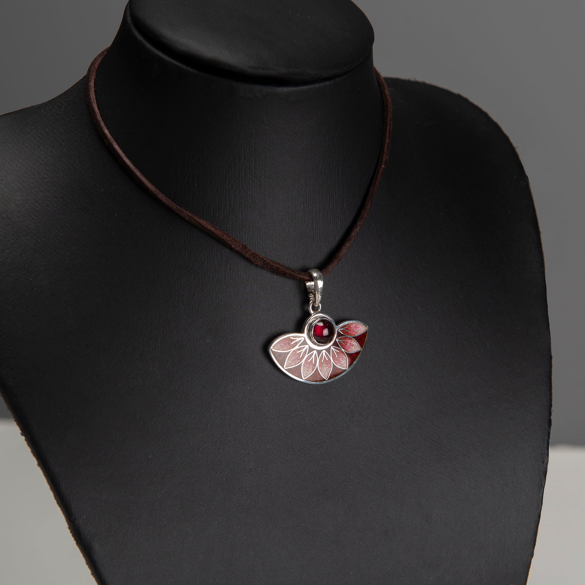 Red Leaves Semicircle Cloisonné Enamel Pendant With Garnet Stone