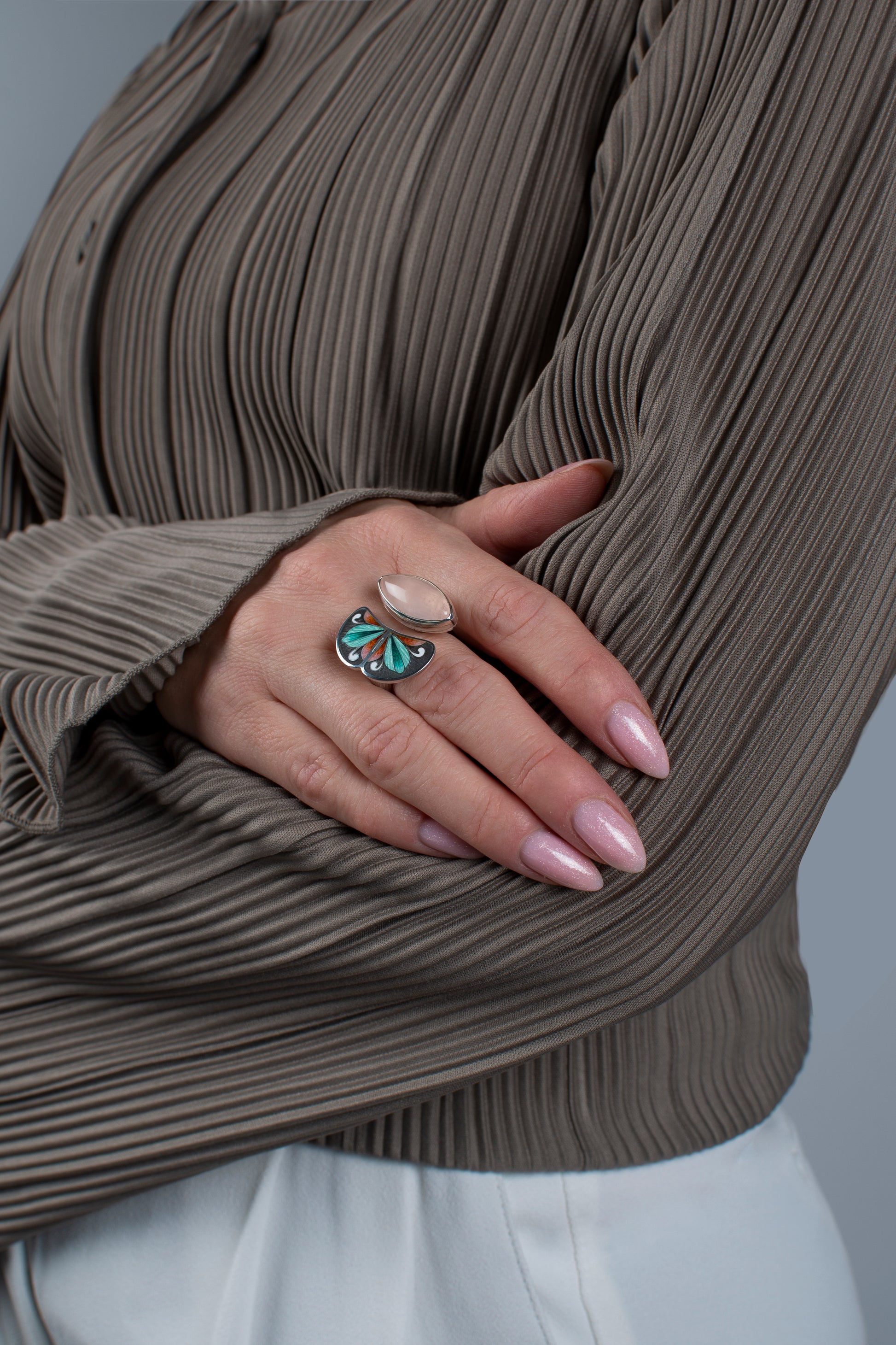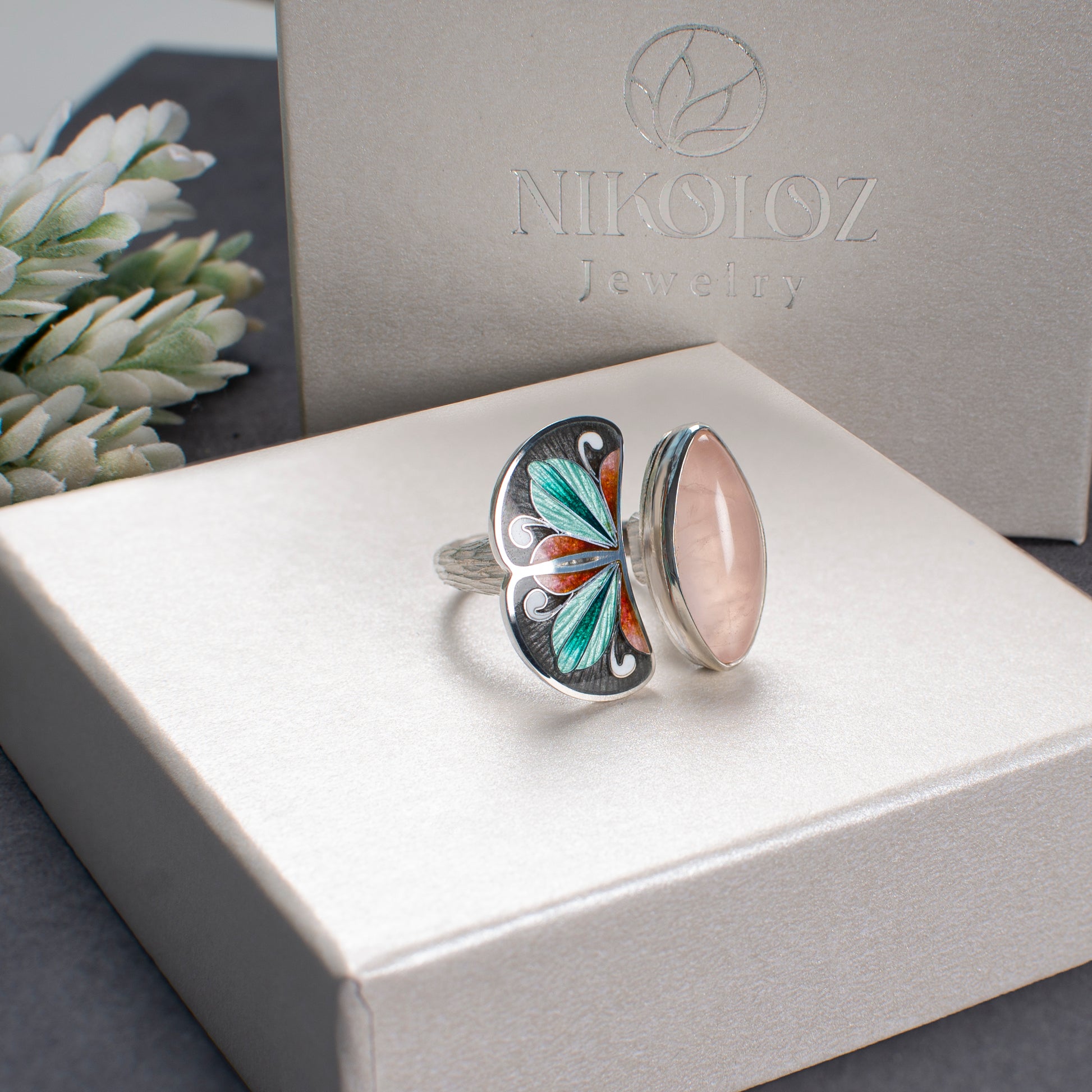 Rose Quartz Ring, Cloisonne Enamel Bohemian Ring
