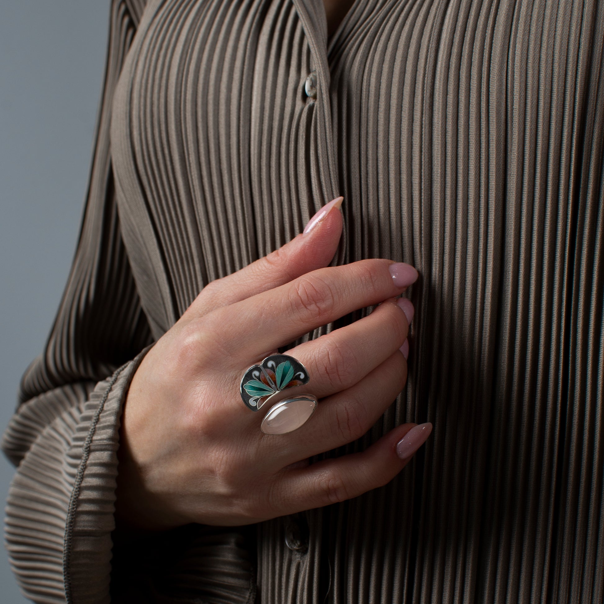 BOHEMIAN ART NOUVEAU ENAMEL RING WITH ROSE QUARTZ STONE AND HAND-TEXTURED BAND