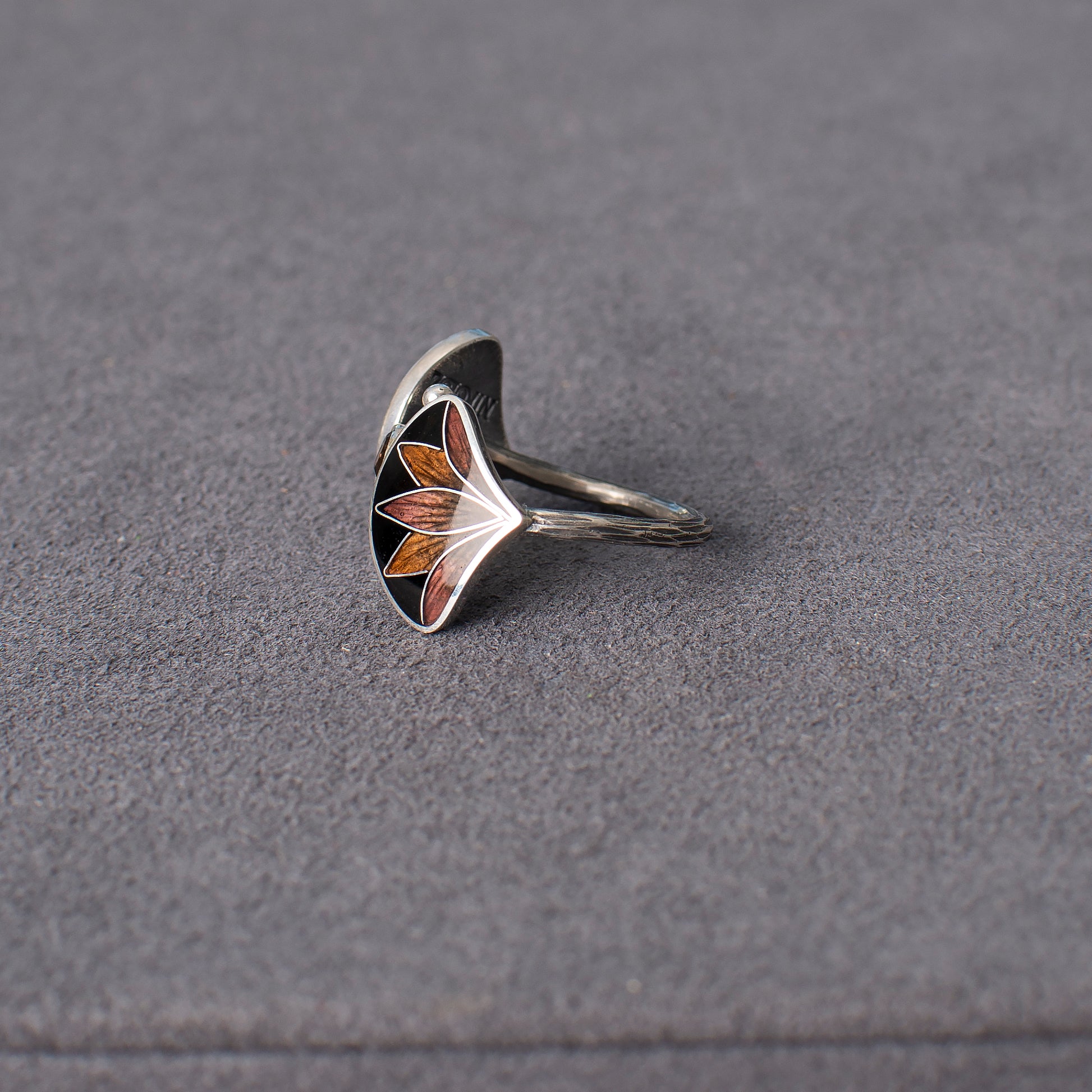 The ring is beautifully made in the shape of a two leaves. The base underneath the enamel layer is engraved which gives pieces even more loveliness and charm. Ring covered with hot transparent enamel. Enamelings is an art of decoration metal surfaces to create colourful and amazing designs. It's a very old and laborious technique.