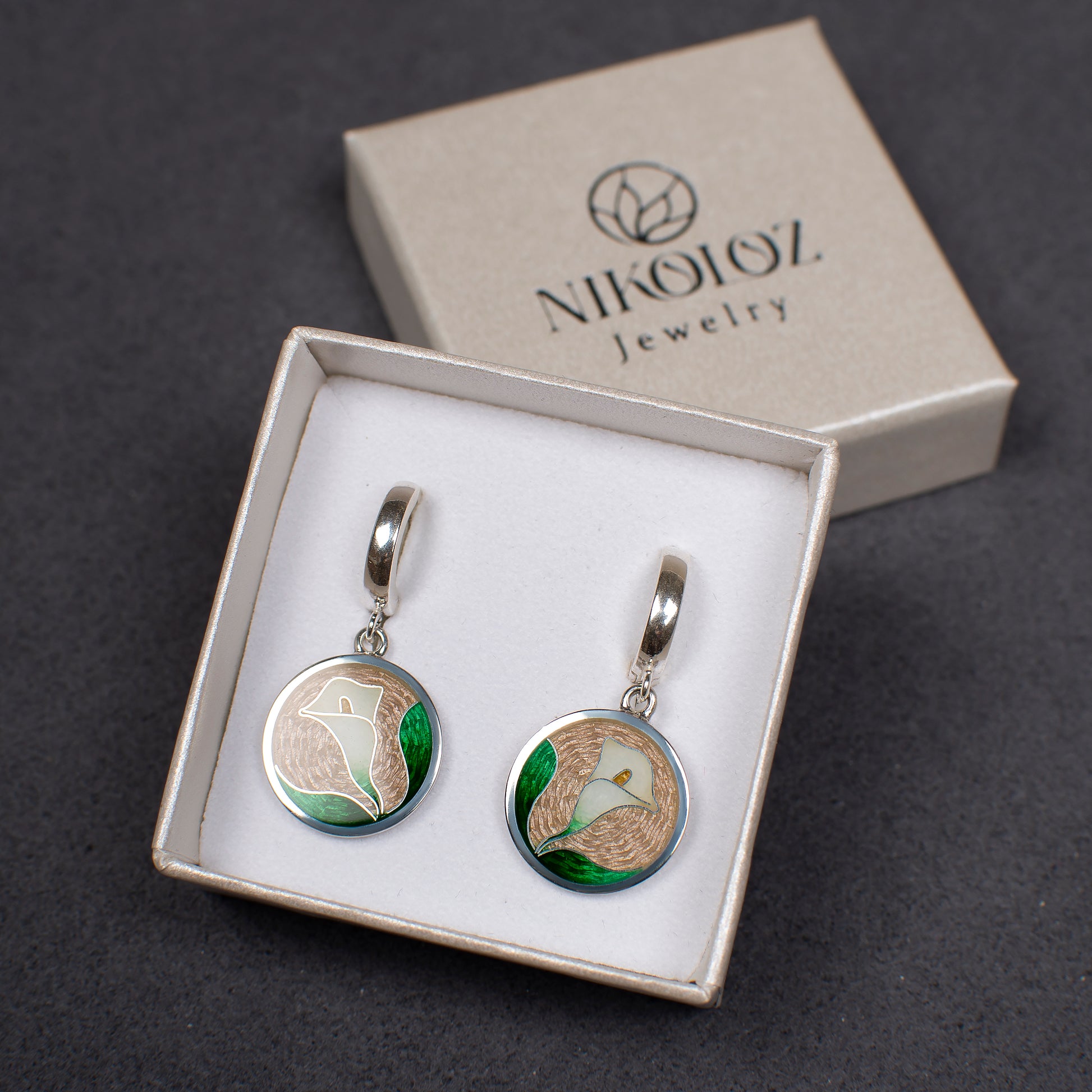A graceful white Calla Lily, symbolising purity and rebirth, set against a textured, champagne-toned background. Secure and comfortable lever back closure has a safe lock and made from Sterling Silver. Earrings covered with hot transparent enamel. Enameling is an art of decoration metal surfaces to create colorful and amazing designs. It's a very old and laborious technique.