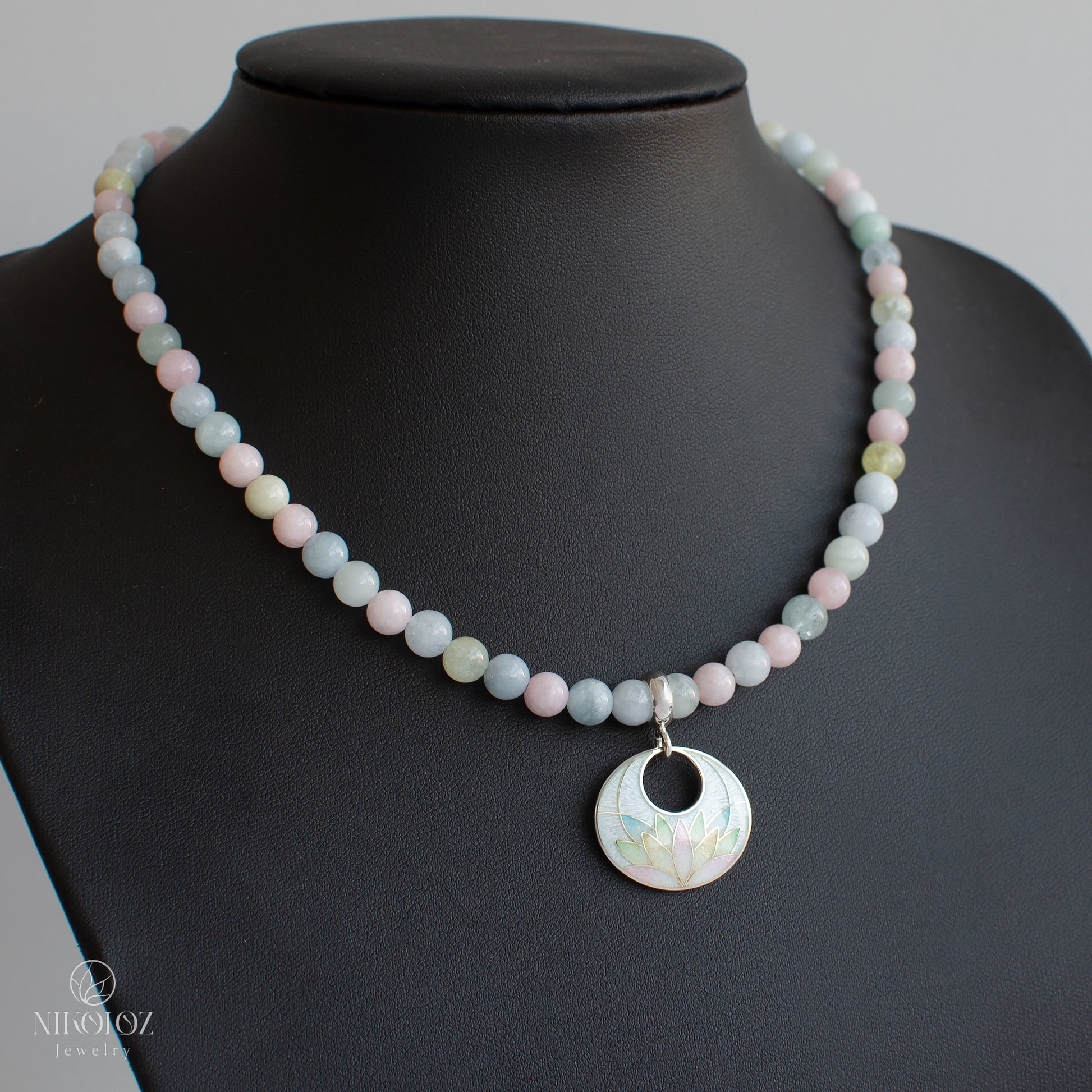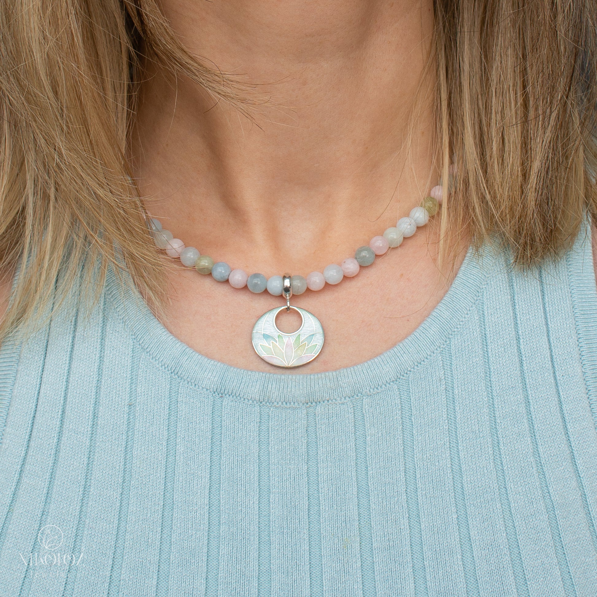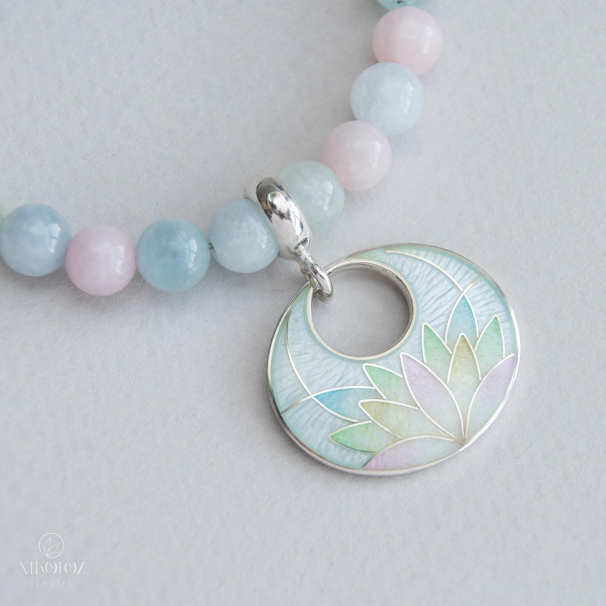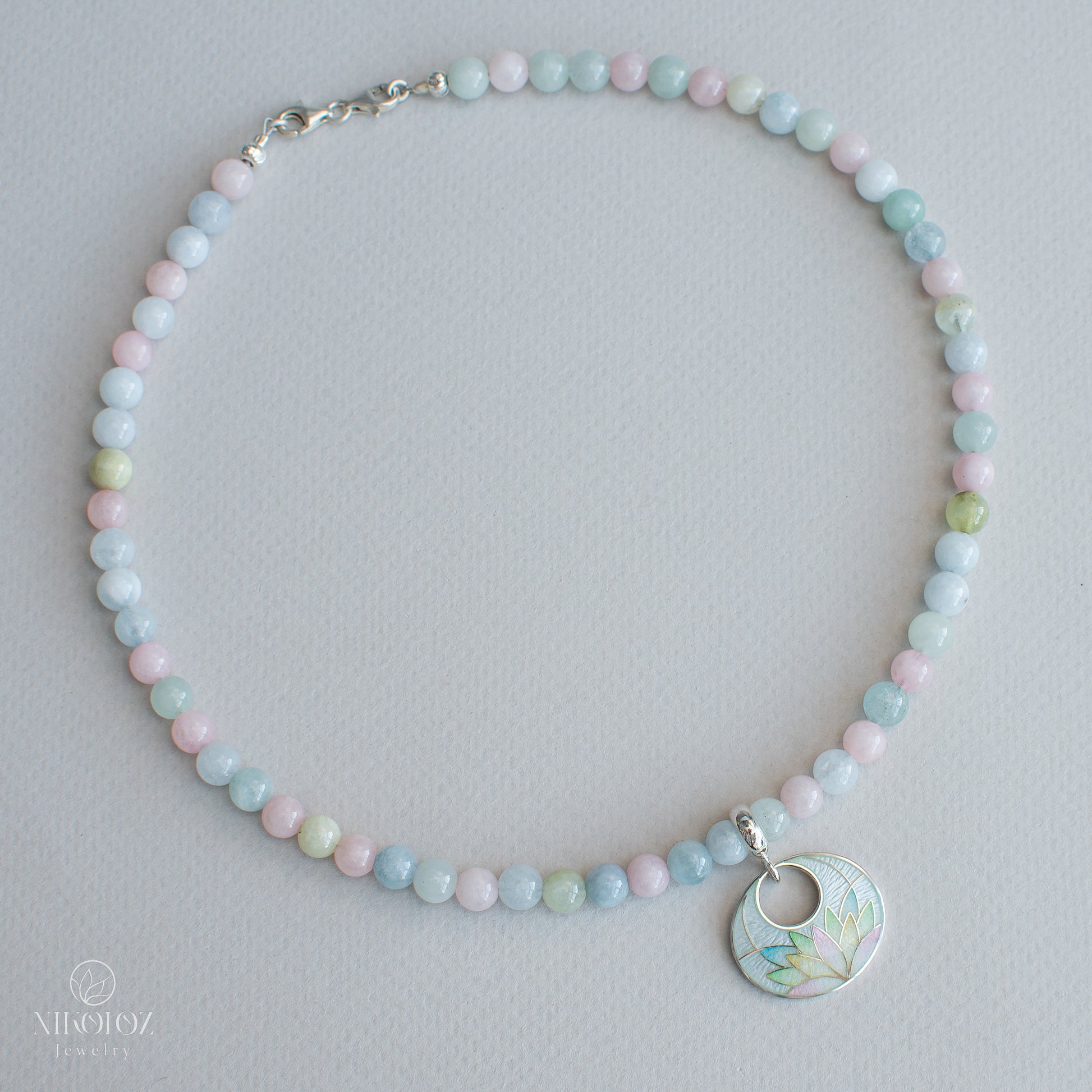 Sterling silver base 925, fine silver wire, cloisonne enamel, 6 mm Aquamarine And Rose Quartz natural beads, silver cable neck chain with lobster claw closure.
