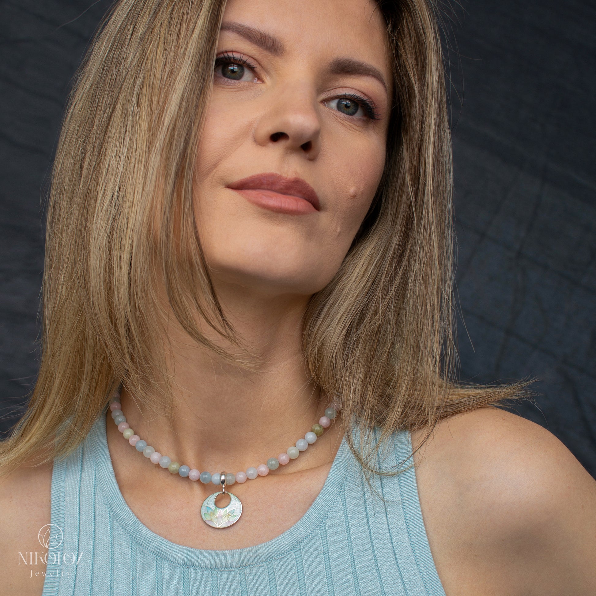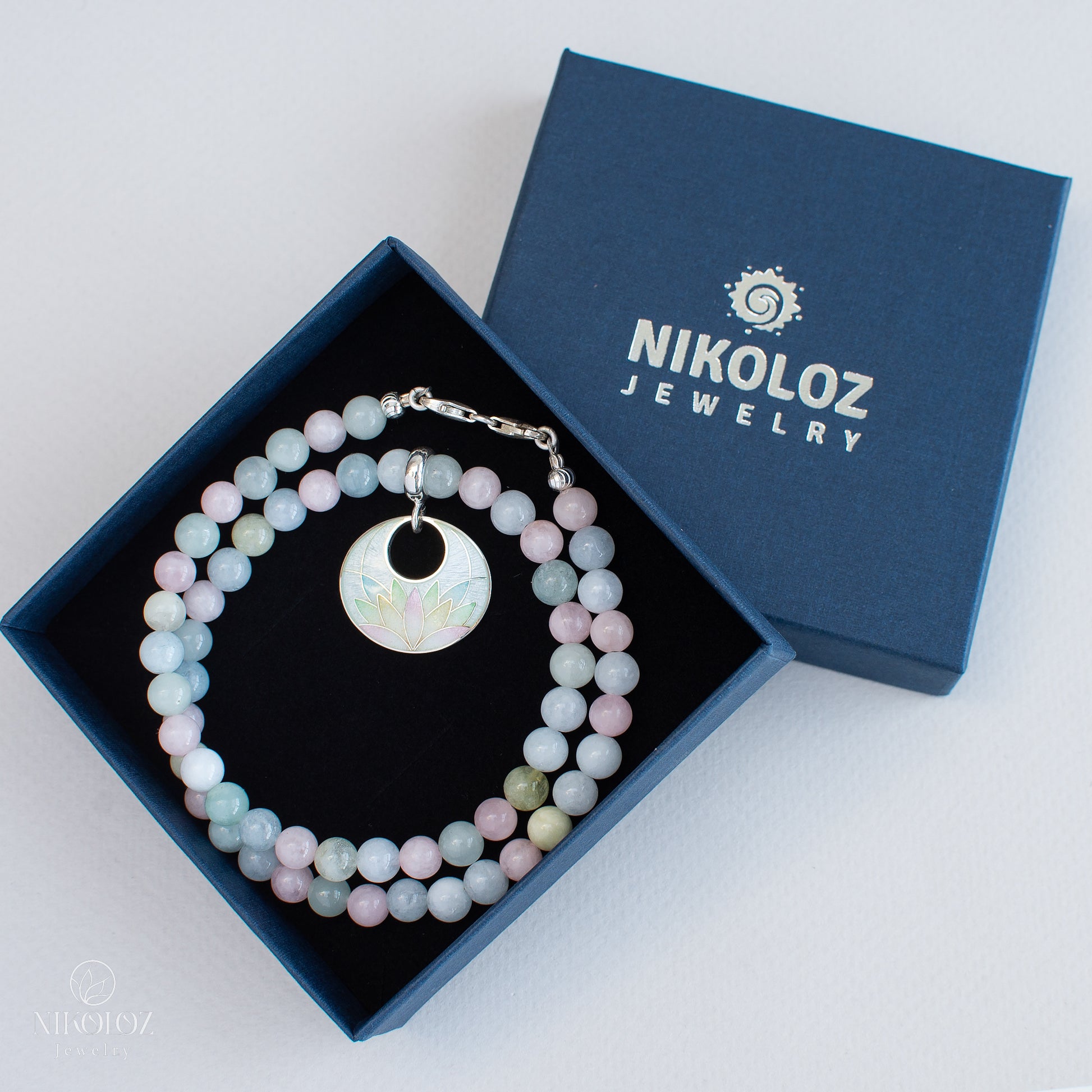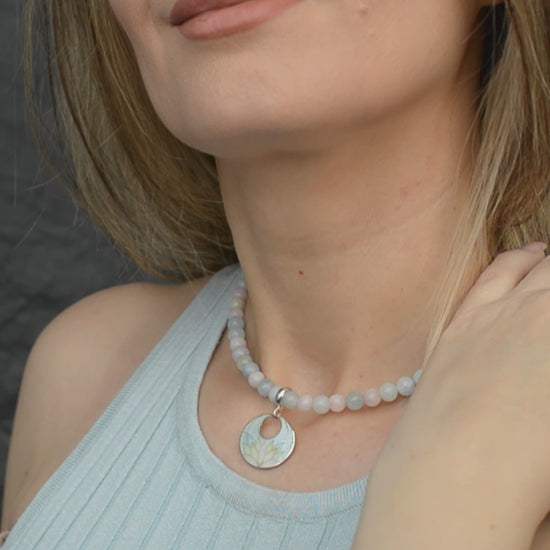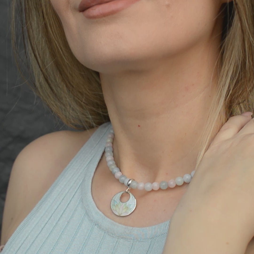 Sterling silver base 925, fine silver wire, cloisonne enamel, 6 mm Aquamarine And Rose Quartz natural beads, silver cable neck chain with lobster claw closure.