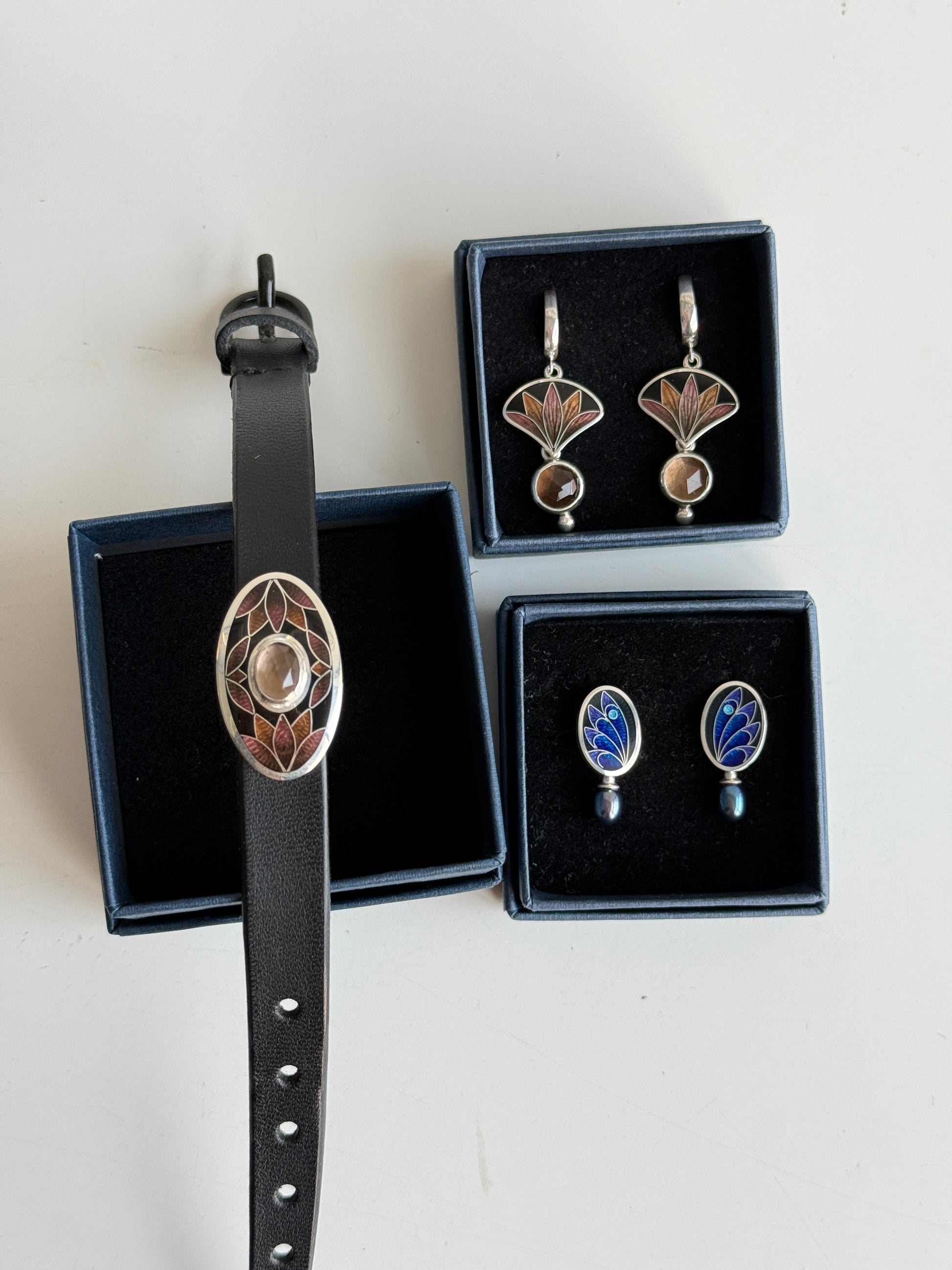 Silver bracelet and earrings with smokey quartz, earrings with pearls